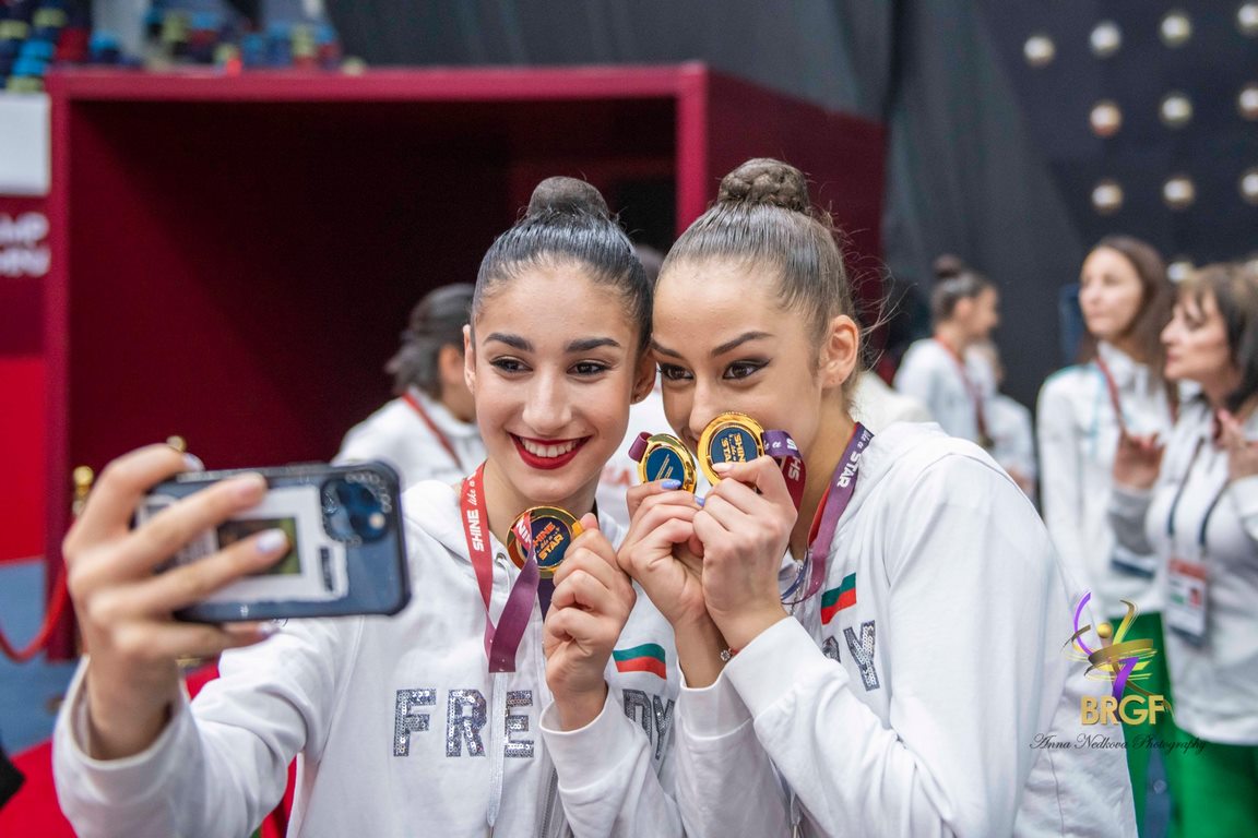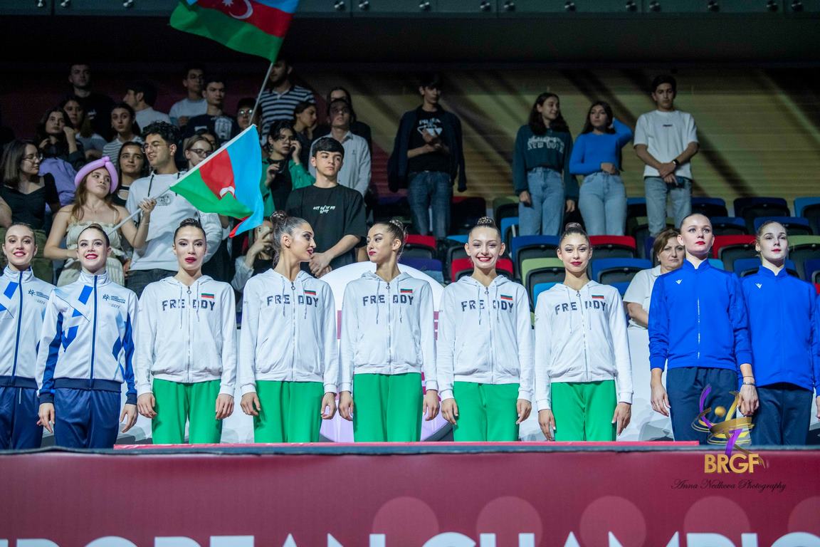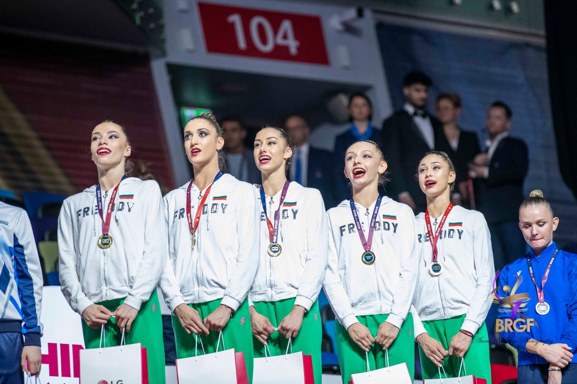 Женина Трашлиева, София Иванова, Камелия Петрова, Рейчъл Стоянов и Радина Томова събраха сбор от 68.050 точки, след като изпълниха без грешка и двете си композиции. Българките получиха оценки от 35.600 за композицията си с пет обръча и 32.450 за три ленти и две топки. Така те добавиха съм световната си титла в многобоя от София 2022 и тази от континенталния шампионат.