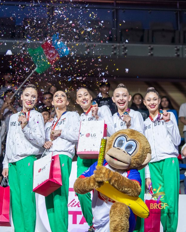 Момичетата, водени от старши треньора на отбора Весела Димитрова и от нейните помощници Михаела Маевска и Ясена Стойнева, изиграха много силно съчетанието си с пет обръча и бяха оценени с 35.600 точки, от които 19.200 за трудност, 7.950 за изпълнение и 8.450 за артистичност.