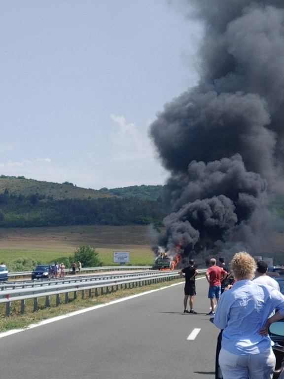 Възможно най-бързо на място са пристигнали екипи на пожарната и линейката. Към този момент пожарът е загасен, но километричните задръствания в следствие на инцидента остават.