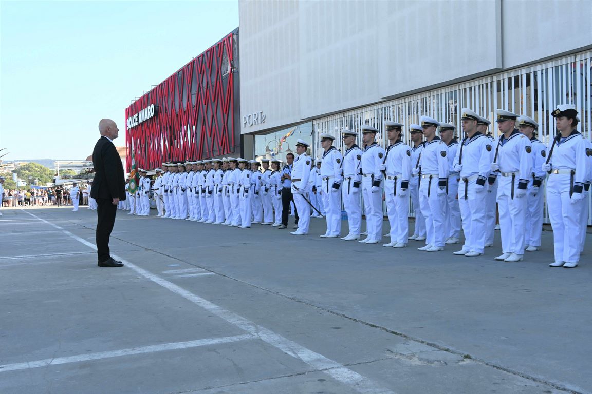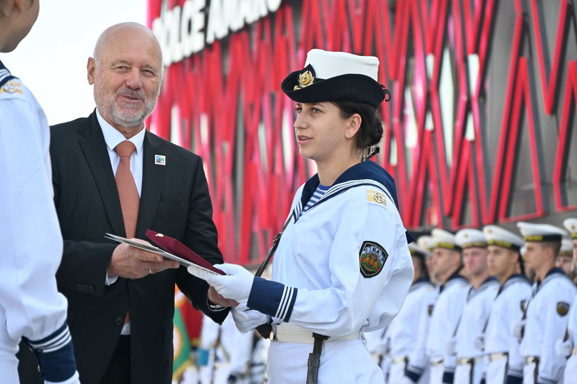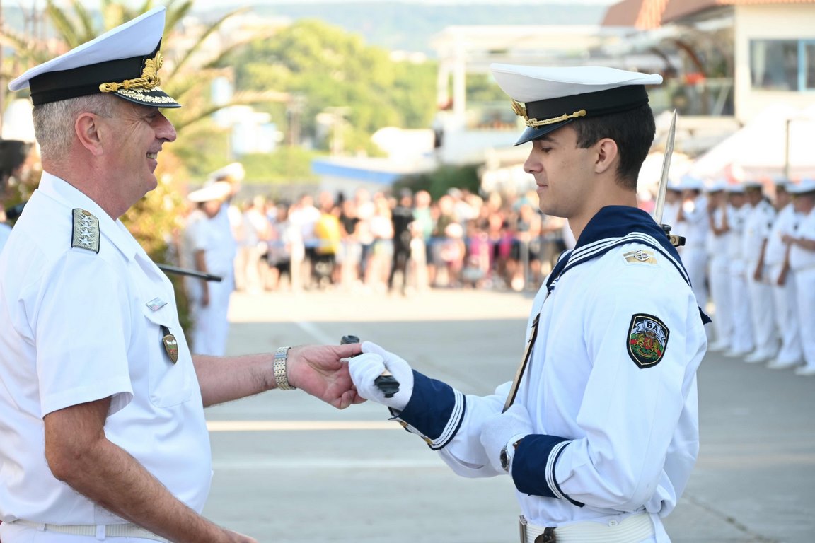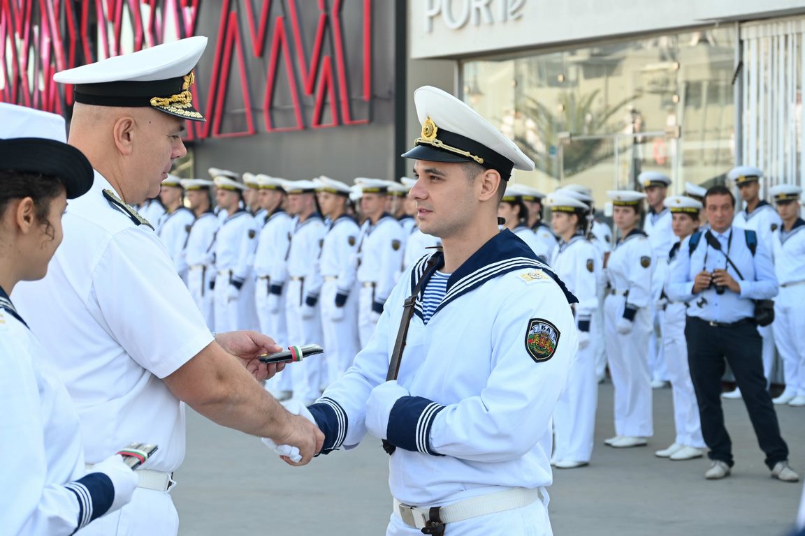 Тази сутрин на Морска гара – Варна се проведоха ритуалите по посрещане на министъра на отбраната на Република България, по тържественото вдигане на флага на Военноморските сили, гюйса, стенговите флагове и флаговете за разцветяване, и по присвояване на първо офицерско звание на курсантите от „Випуск – 2023” от специалност „Организация и управление на тактическите подразделения от ВМС” на Висшето военноморско училище „Н. Й. Вапцаров”.