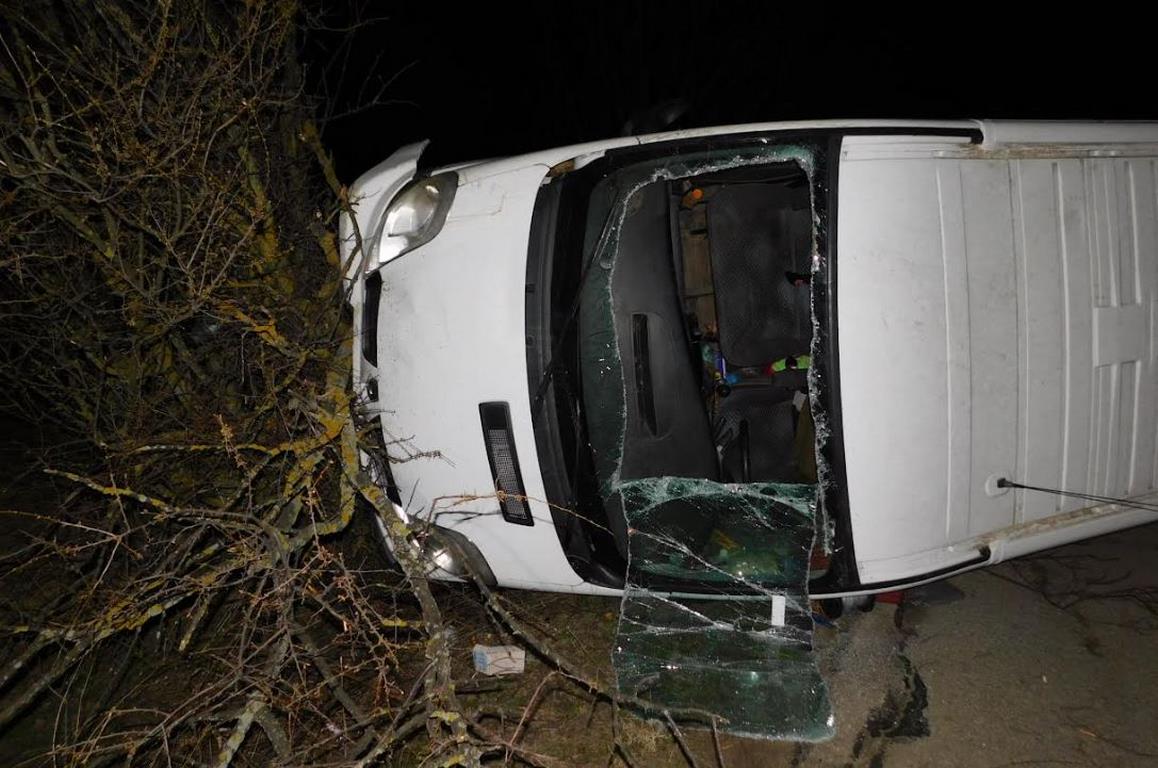 На мястото е установен обърнат бус „Рено Трафик“ с двама мъже. При управление на автомобила 48-годишният водач губи контрол над автомобила, напуска пътното платно и се удря в крайпътни дървета. Пробата му за употреба на алкохол отчела 1,45 промила в издишания въздух.
