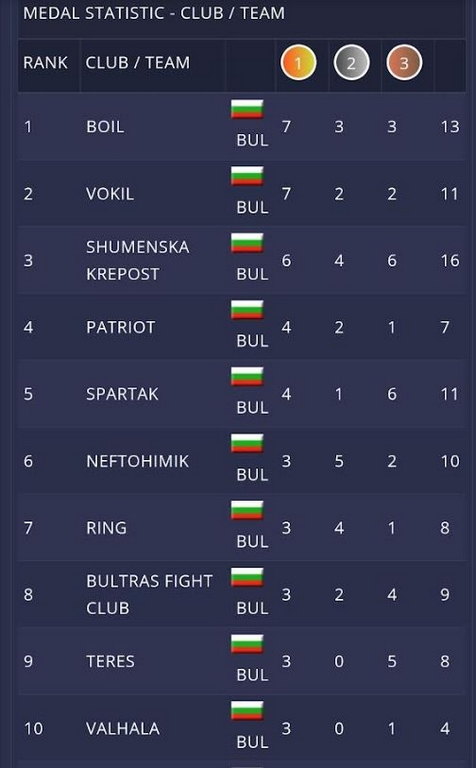 Най-много медали завоюваха спортистите от варненския клуб „Боил“. След това се нареждат варненският СК „Вокил“ и шуменският СК „Шуменска крепост“.