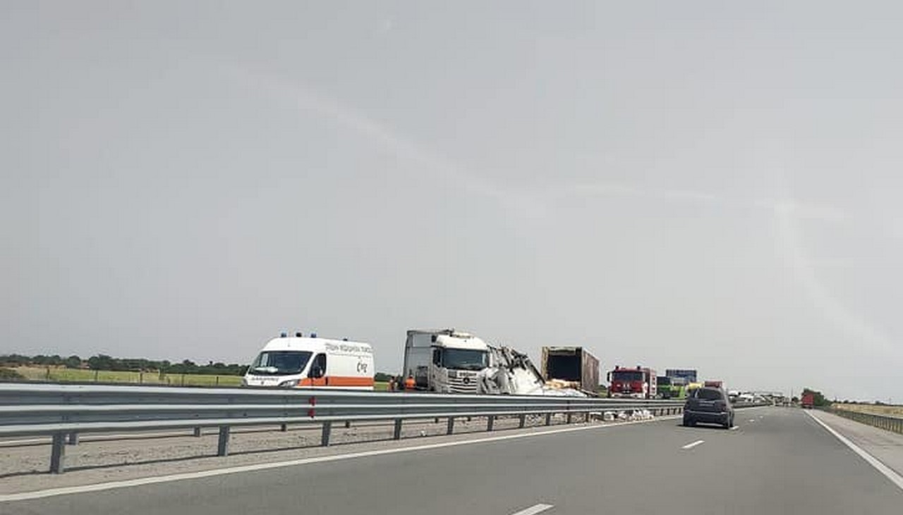 Два тира са се сблъскали на автомагистрала „Тракия“ на 157-и километър между отбивките за Белозем и Първомай. Инцидентът се е случил в платното за Пловдив. Катастрофата е довела до километрична колоната от автомобили.