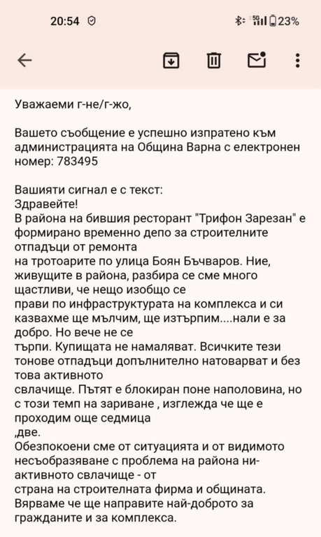 „В района на бившия ресторант „Трифон Зарезан“ е формирано временно депо за строителните отпадъци от ремонта на тротоарите по улица Боян Бъчваров. Ние, живущите в района, разбира се сме много щастливи, че нещо изобщо се прави по инфраструктурата на комплекса и си казвахме ще мълчим, ще изтърпим….нали е за добро. Но вече не се търпи. Купищата не намаляват. Всичките тези тонове отпадъци допълнително натоварват и без това активното свлачище. Пътят е блокиран поне наполовина, но с този темп на зариване, изглежда че ще е проходим още седмица, две. Обезпокоени сме от ситуацията и от видимото несъобразяване с проблема на района ни – активното свлачище – от страна на строителната фирма и общината. Вярваме че ще направите най-доброто за гражданите и за комплекса, завършва сигналът“, алармират варненци в сигнал до Общината.