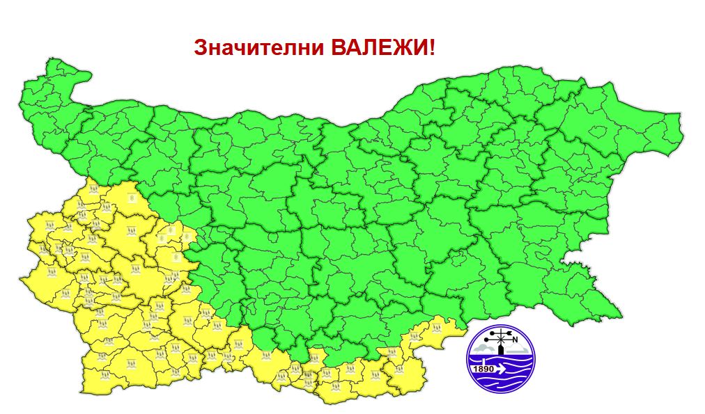 Жълт код е обяен в областите: София – област, София – град, Перник, Кюстендил, Благоевград, Пазарджик, Смолян, Кърджали, Хасково.