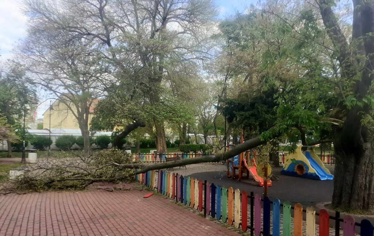 „Цяла България градушки, бури и наводнения, във Варна поваля малко и отново падна дърво! За трети път тази година, на същата детска площадка! Най-голямата в центъра на града и с нито една напълно здрава люлка!“, пише Стефан Ножчев.