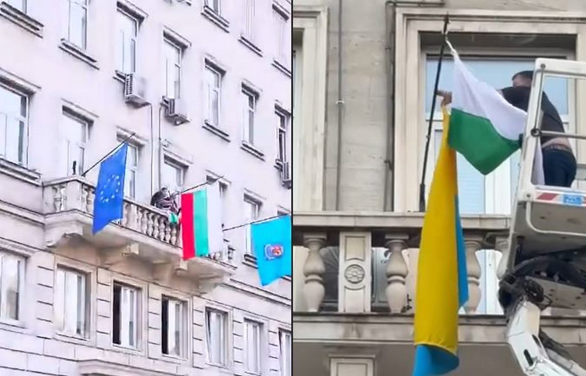 Екшън като на кино се разигра пред сградата на Столична община, където бившият депутат от БСП Страхил Ангелов използва вишка, за да свали украинското знаме, развяващо се до българския трибагреник. Действието си той документира с видео, разпространено в социалните мрежи, и го определи като „поправяне на несправедливост“.