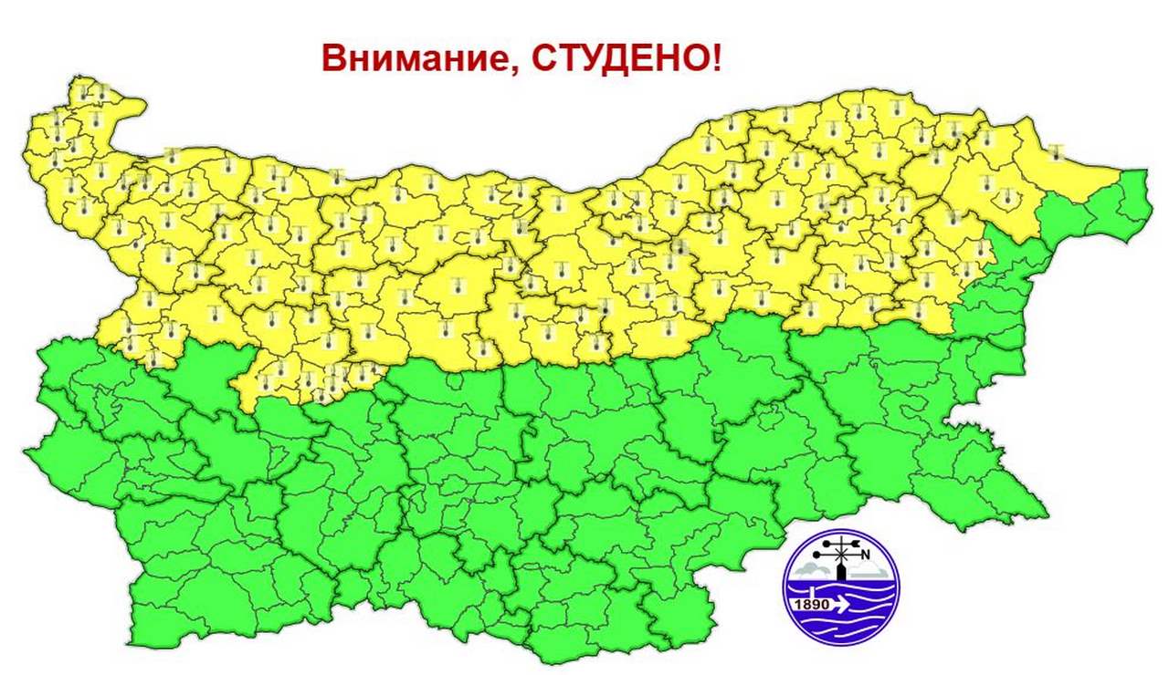 На 20 януари област Варна ще бъде сред засегнатите региони с жълт код за много ниски температури, сочи официалната прогноза на Националния институт по метеорология и хидрология. Очаква се сутрешните стойности да се доближат до минус 10°C.