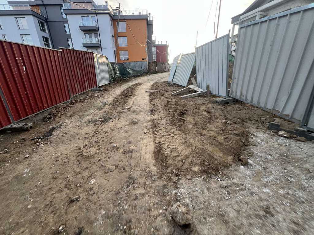 След масовото застрояване пътят ставаше все по-зле, до преди няколко месеца, когато започнаха да строят още два обекта без никакъв контрол или пазене на пътната настилка. За това на 16.12.25 г. подадох първия сигнал за унищожаване на инфраструктурата от тежки машини, изсипващи земна маса по пътя, разнасяне на кал по улиците, изрязване на асфалта за включване към ВиК и никакво възстановяване, както и опасни падащи заграждения ежедневно.