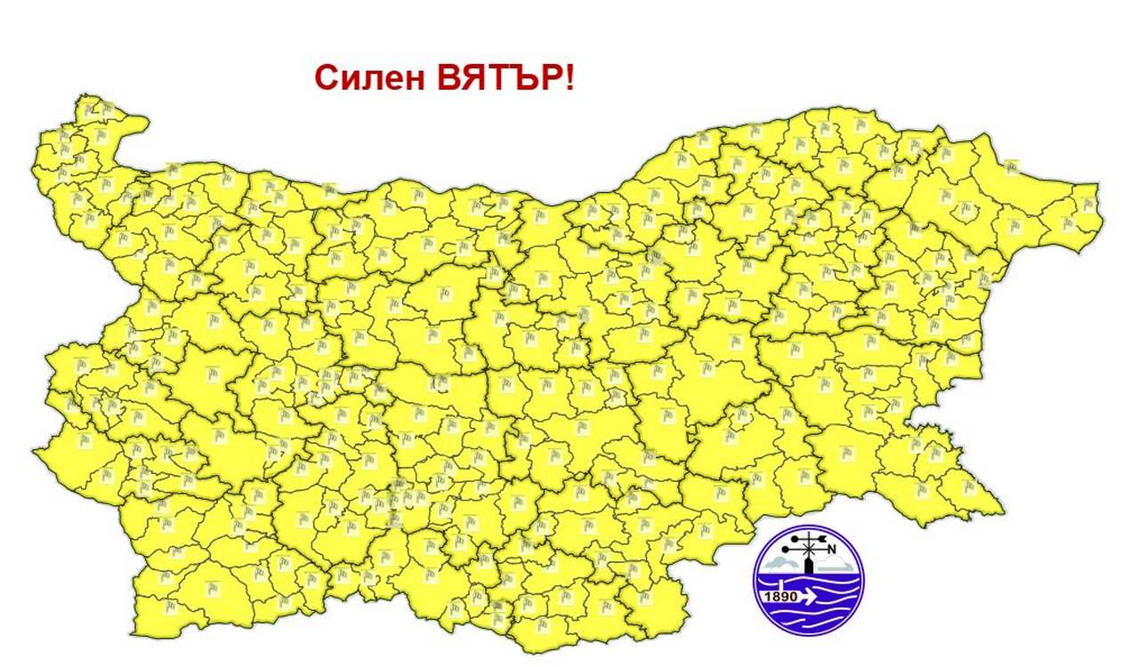 За днес жълтият код важи за шест области — Видин, Монтана, Враца, Плевен, Велико Търново и Сливен. Очаква се усилване на вятъра до 14–19 метра в секунда, с пориви до 24 метра в секунда.